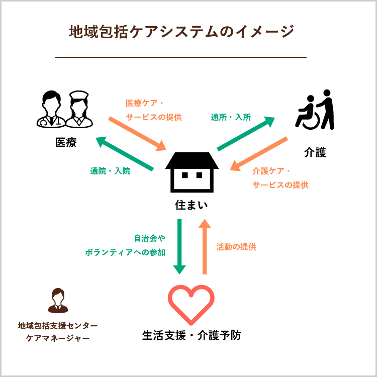 高齢者が、住み慣れた地域や自宅で日常生活をおくるには、地域の医療機関や介護施設、行政機関が連携し協力する事が必要です。そこで、地域における「住まい」「医療」「介護」「予防」「生活支援」の5つのサービスを、一体的に提供できるケア体制を「地域包括ケアシステム」と言います。家族やケアマネージャーと相談しながら、入院の受入れを相談します。