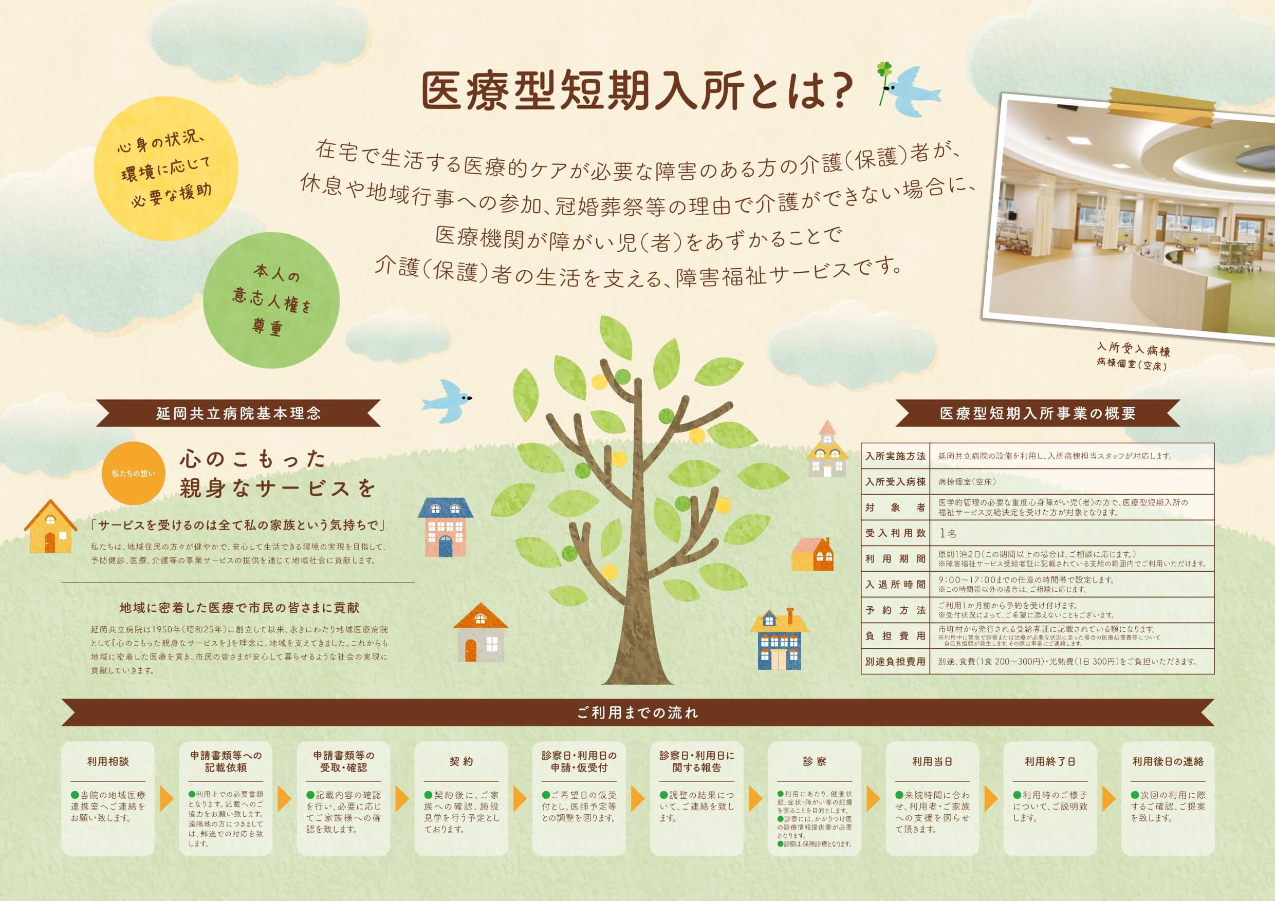 在宅で生活する医療的ケアが必要な障害のある方の介護(保護)者が、休息や地域行事への参加、冠婚葬祭等の理由で介護ができない場合に、医療機関が障害児(者)をあずかることで介護(保護)者の生活を支える、障害福祉サービスです。