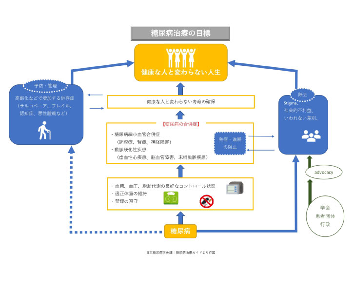 糖尿病治療の目標は、さまざまな合併症が起こらないようにし、もし合併症が起きても軽くて済むようにし、身体的にも社会的にも何の不利益もこうむることなく、健康な人と同じように健康寿命を享受することにあります。