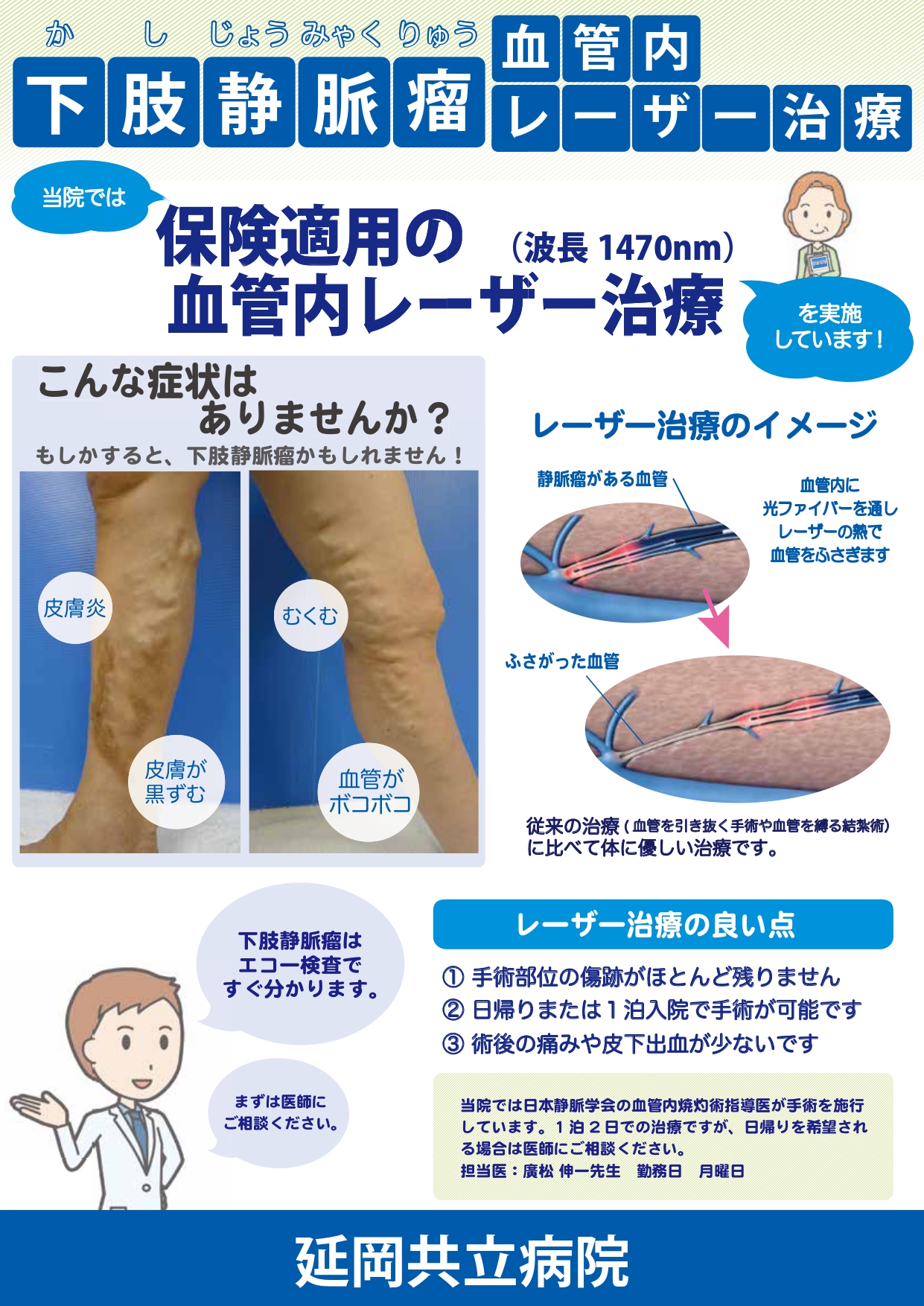 当院では、4月よりこの逆流している静脈を焼灼するレーザーを導入しましたので、局麻下に1泊2日で治療を行っております。現在は週1日のみの治療ですが、将来的に人員がそろえば、治療は毎日可能になります。
