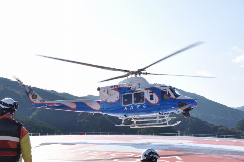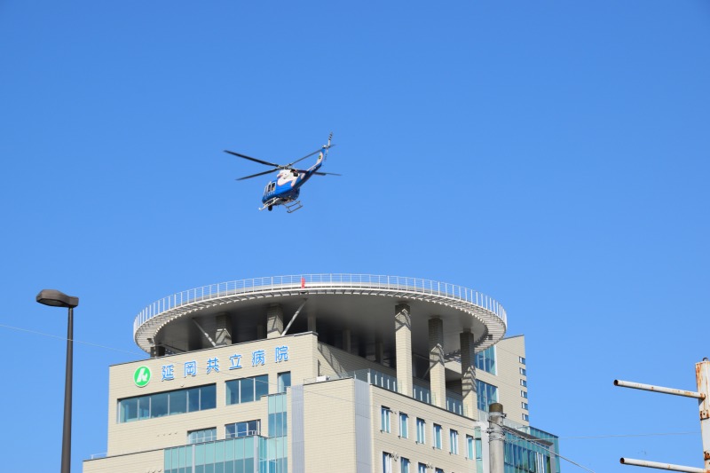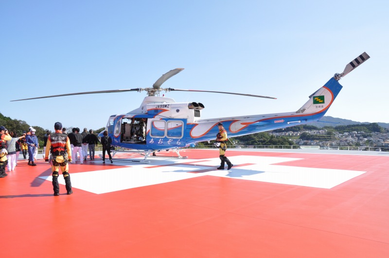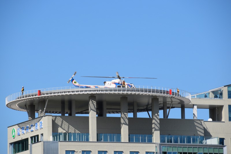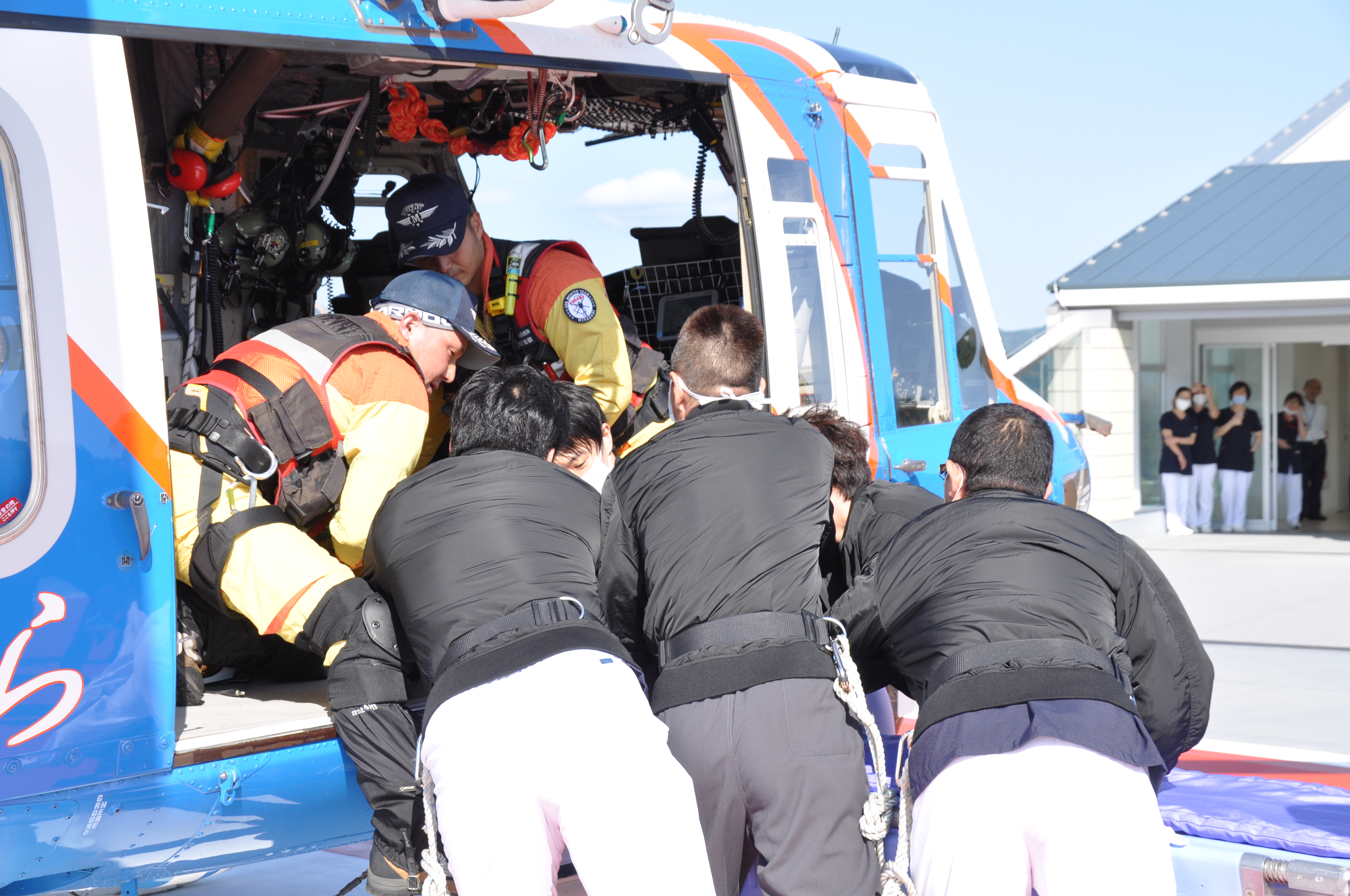 2020年(令和2年)10月1日に最上階に設置したヘリポートで、県防災救急ヘリコプター「あおぞら」と連携した、初の訓練を実施しました。訓練は当初、移転開院の直後に予定していましたが新型コロナウイルス感染症による影響で延期となり、今回の実施となりました。