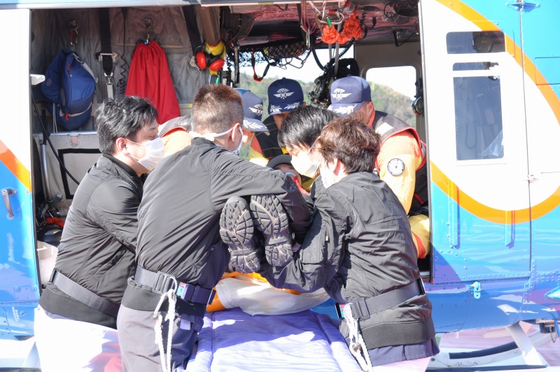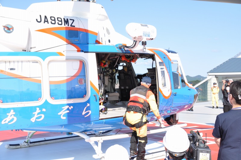 訓練は、午後2時に宮崎空港を離陸した「あおぞら」が、同2時25分に当院のヘリポートに着陸し、「あおぞら」の航空消防隊員から機体の性能や機内の装備などについての説明を受けた後、ストレッチャーを使用し患者の引継ぎ訓練を行い、航空消防隊員からヘリコプターから引き継ぐ際の注意が呼びかけられました。その後、医師など訓練参加者8人が2班に分かれ「あおぞら」に搭乗し、体験飛行を実施しました。機内の狭さやヘリコプター内の音の大きさなどを体験しました。