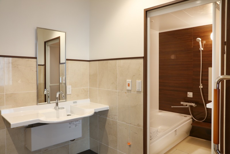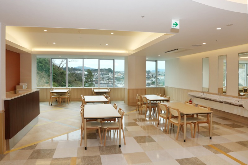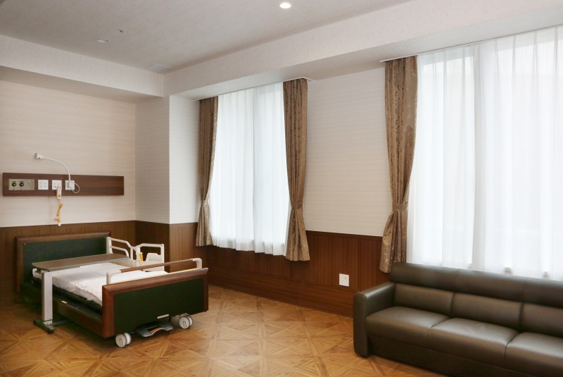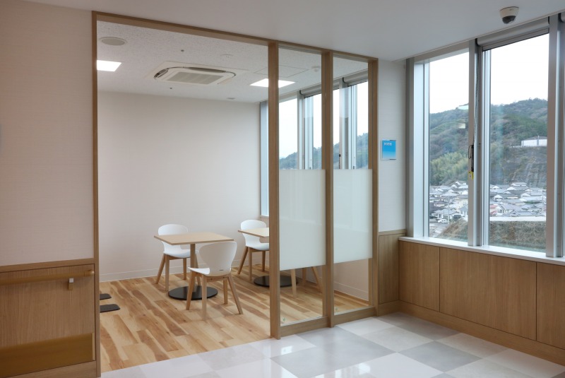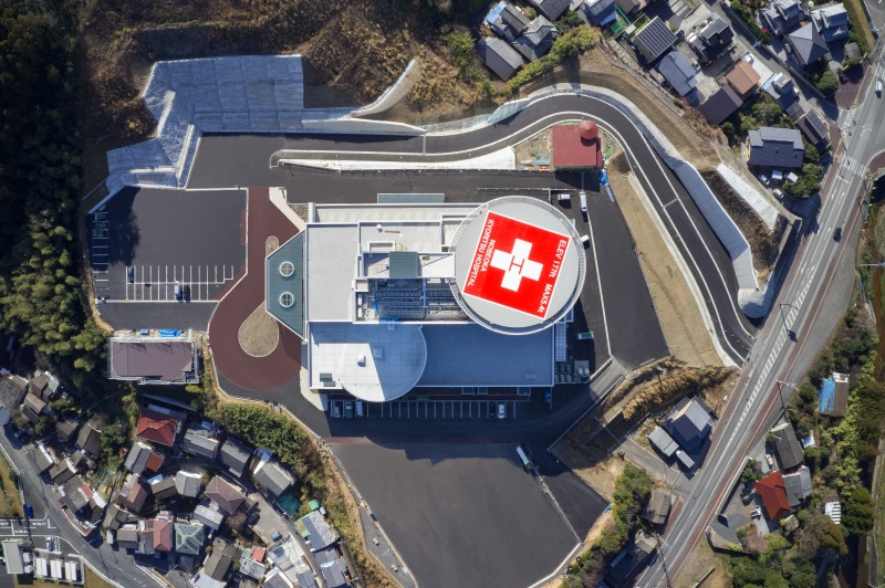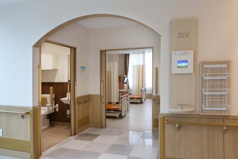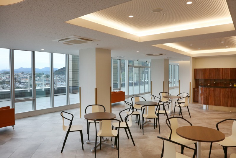 病室は、患者様のプライバシー向上のために個室を27部屋設け、6階には飲食などが楽しめる展望ラウンジがあり、屋外にもテーブルやいすを配置しています。駐車場も約270台分あり、新たに玄関に路線バスの乗り場を設けました。