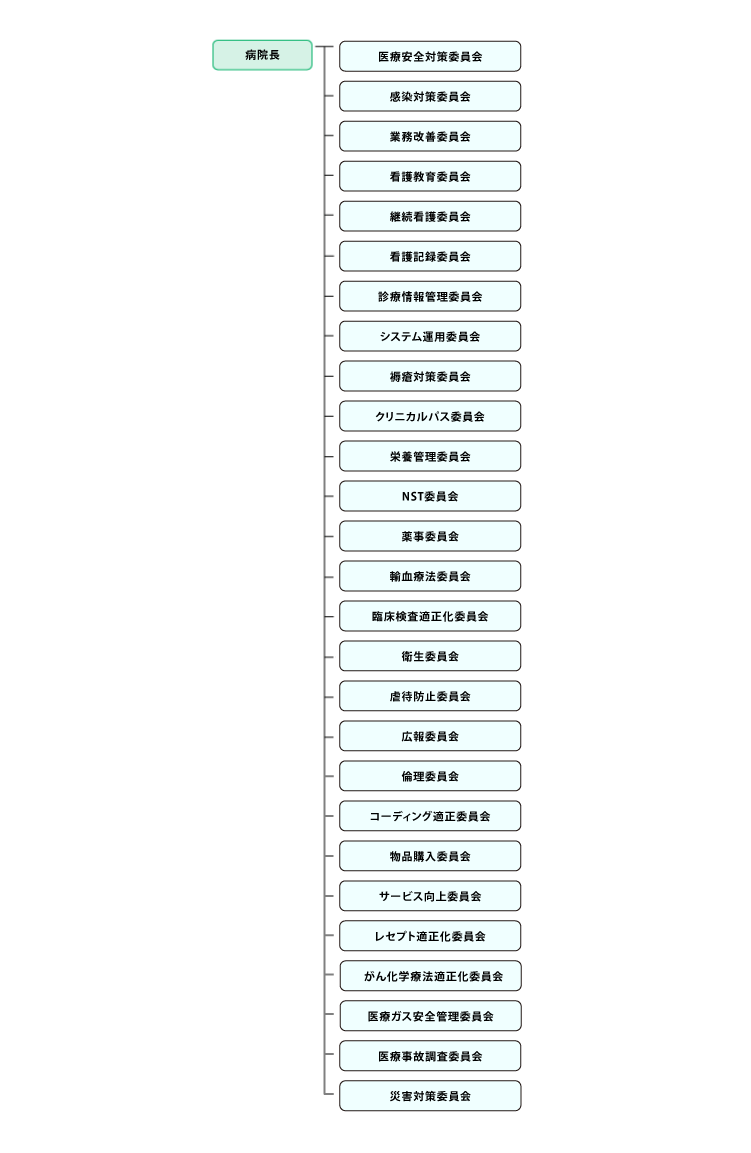 共立病院 介護老人保健施設 東海園 院長 地域医療連携科 診療部 外来 外 科 肝臓外科 消化器外科 心臓血管外科 乳腺外科 肛門外科 整形外科 内 科 循環器内科 消化器内科 呼吸器内科 糖尿病内科 脳神経内科 総合診療科 心療内科 皮膚科 小児科 放射線科 リハビリテーション科 当病院では、病院の運営にあたり各種委員会を設け更なるサービス向上の為に、積極的に取り組んでいます。ここではそれら委員会と、その取り組み内容について簡単にご紹介します。