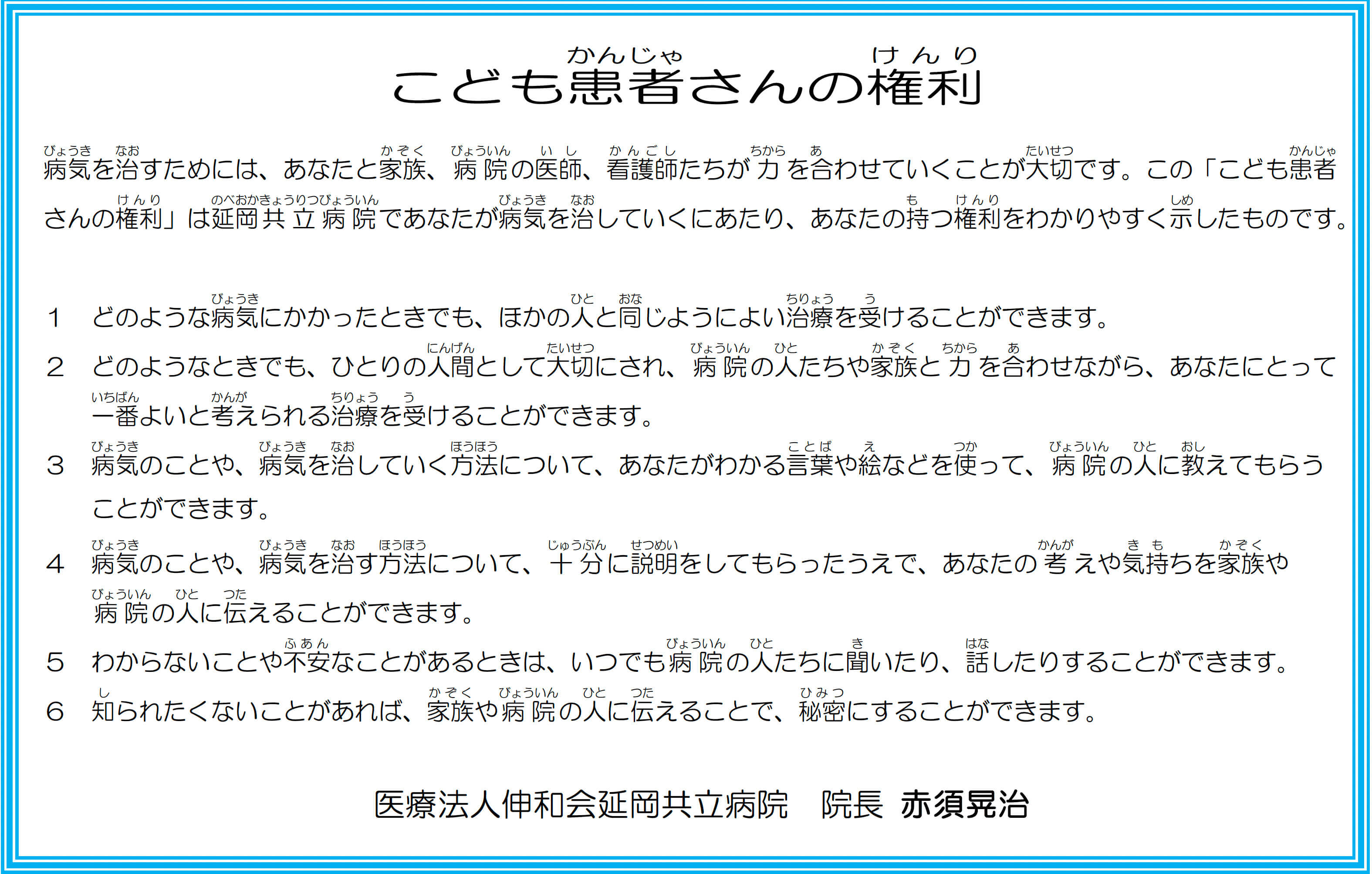 病気を治すためには、あなたと家族、病院の医師、看師たちが力を合わせていくことが大切です。この「こども患者さんの権利」は延岡共立病院であなたが病気を治していくにあたり、あなたの持つ権利をわかりやすく示したものです。