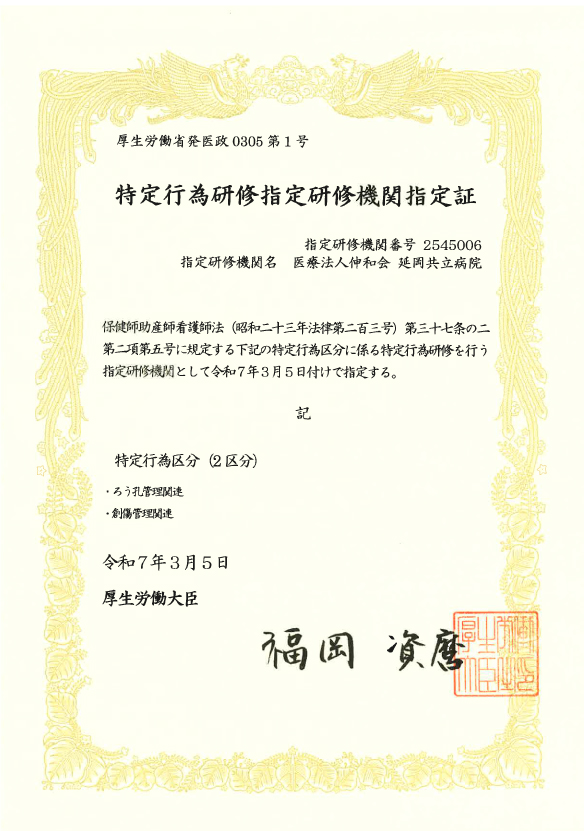 当院は、保健師助産師看護師法に規定される「特定行為区分に係る特定行為研修」を行う指定研修機関として、令和7年3月5日付けで厚生労働省より指定されました。 指定された特定行為区分については、以下の2区分となります。