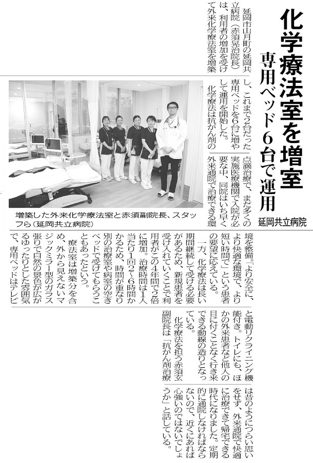 利用者の増加を受け外来化学療法室を増築し、専用ベットを6台に増やし運用を開始しました。