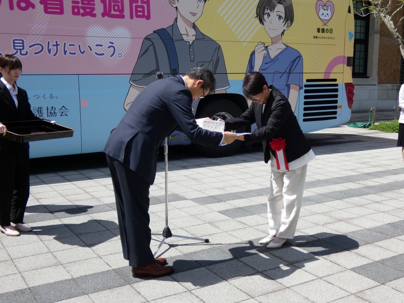 高齢化社会を迎え、保健・医療・福祉分野での看護への要請がより一層高まる中、宮崎県では、この看護の日に、長年にわたって看護業務に貢献された看護師に対して、宮崎県知事表彰を行っています。今年は、県内5名の看護師が選ばれ、このうち、県北より当院の職員である細元みどりさん(元看護部長)が県知事より表彰されました。