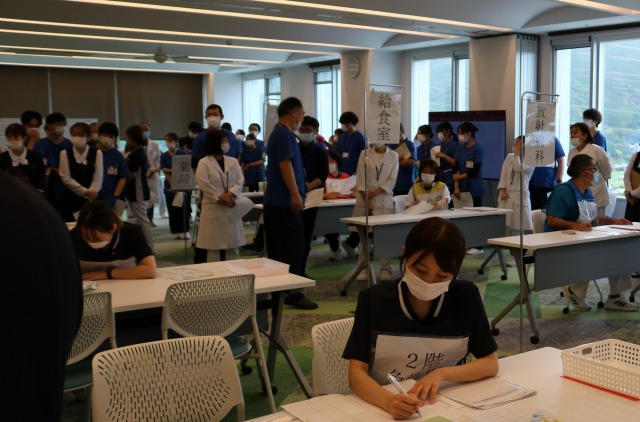 訓練では、入院病棟をイメージしたブースを設置し、さらに放射線科・検査科・栄養科・リハビリ科・薬剤科のブースを用意しました。
