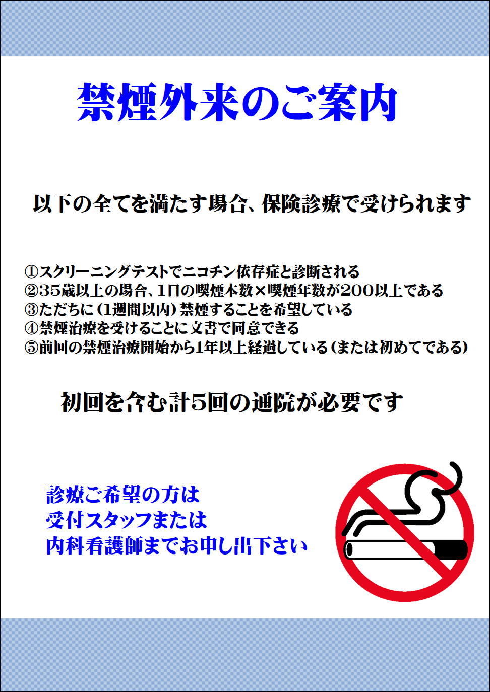 当院では禁煙したい、禁煙を考えている皆様のお手伝いをさせていただきます。