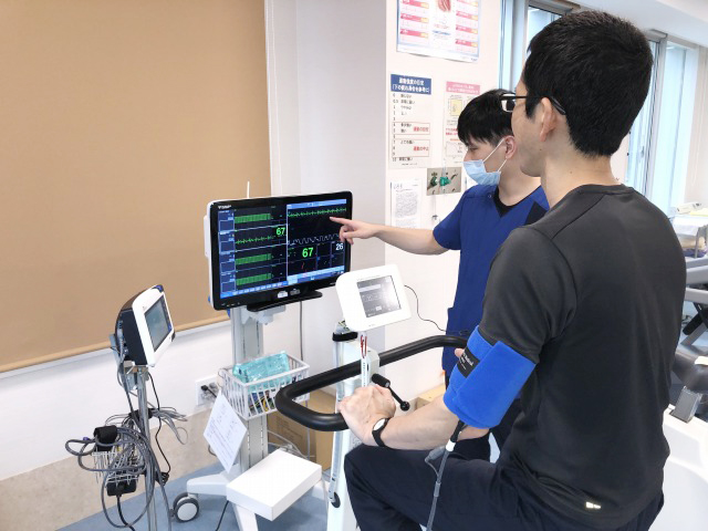 病状が安定していない患者様に対しては、心臓に急激な負担がかからないように心電図や血圧などのメディカルチェックを実施しながら立位や歩行訓練を実施していきます。病状が安定すれば、心臓リハビリテーション室で有酸素運動やレジスタンストレーニングなどの運動療法を実施していきます。また、在宅でも安全に過ごせるように、日常生活指導を行っております。