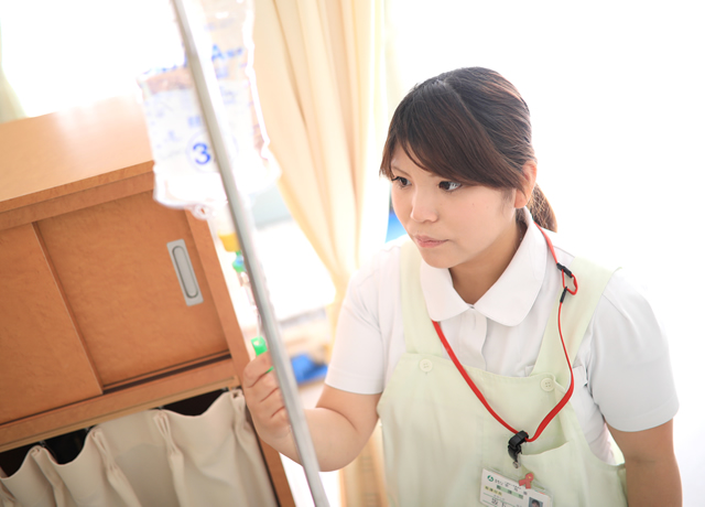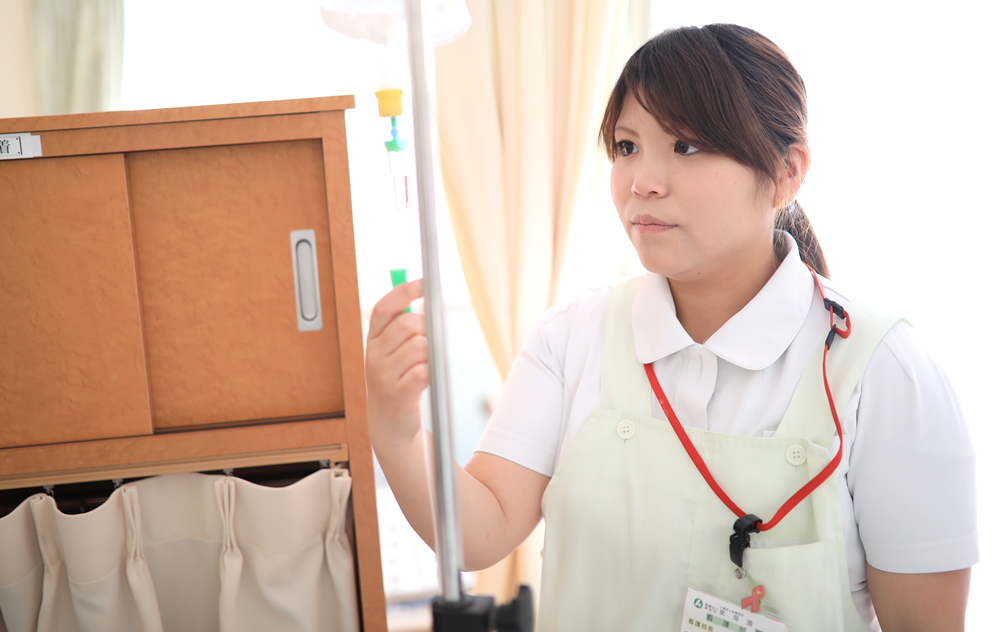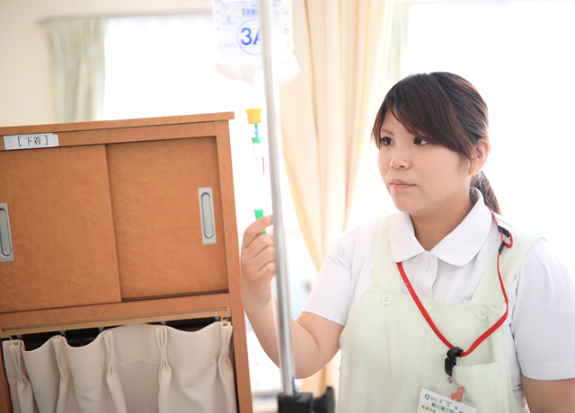 - 利用者様に関する看護業務全般ですが、主に体調管理や、内服介助・点滴管理・処置等をしています。食事介助、排泄介助もおこなっています。