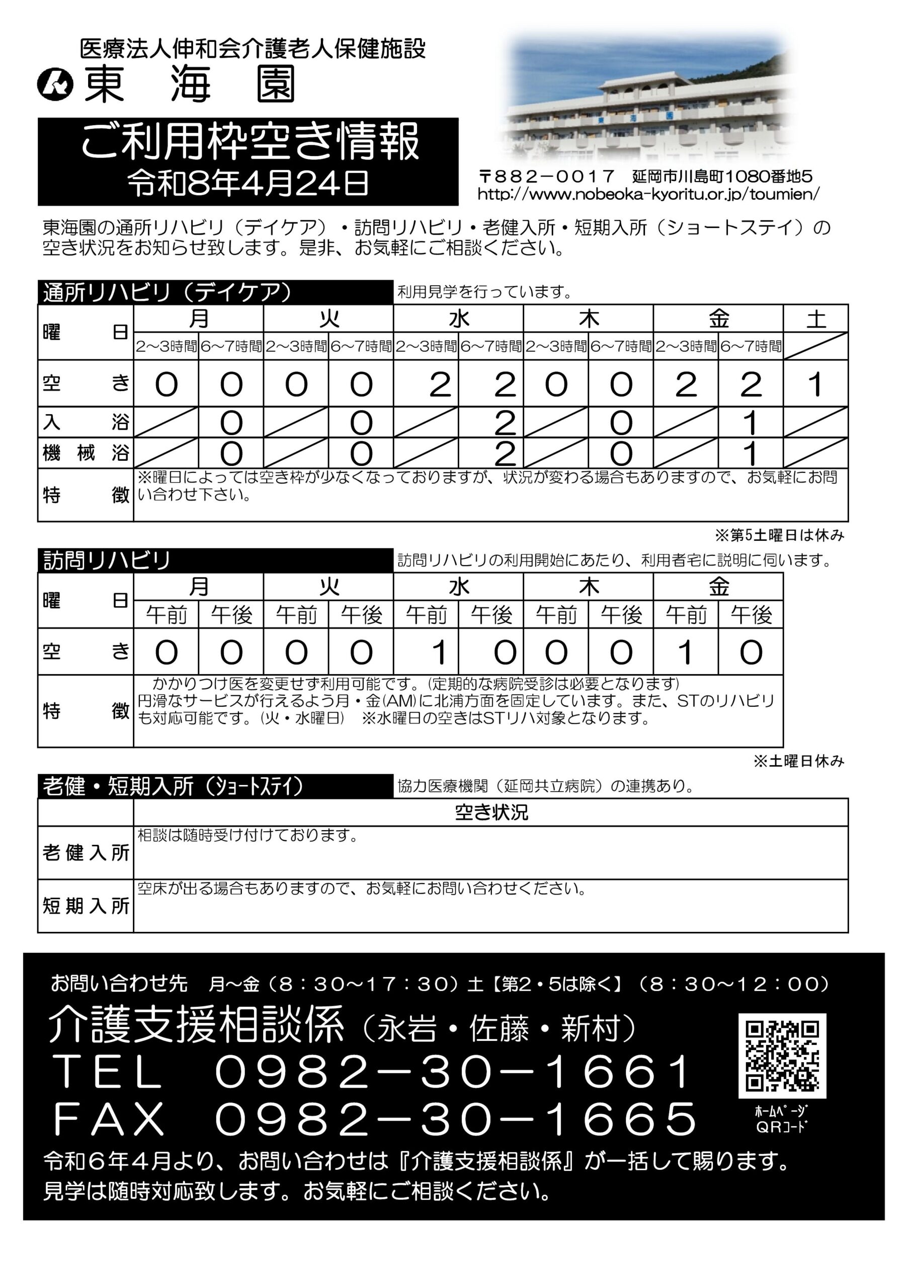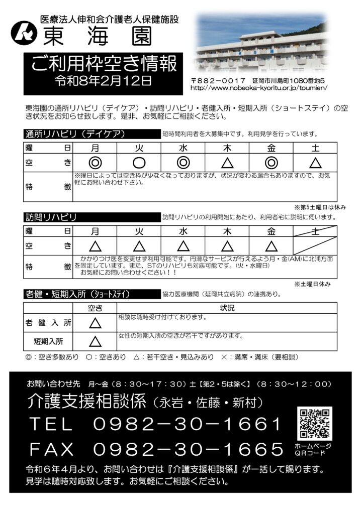 東海園の各介護サービス ①通所リハビリ(デイケア) ②訪問リハビリ ③老健入所 ④短期入所(ショートステイ)の、ご利用枠空き(空席)情報です。